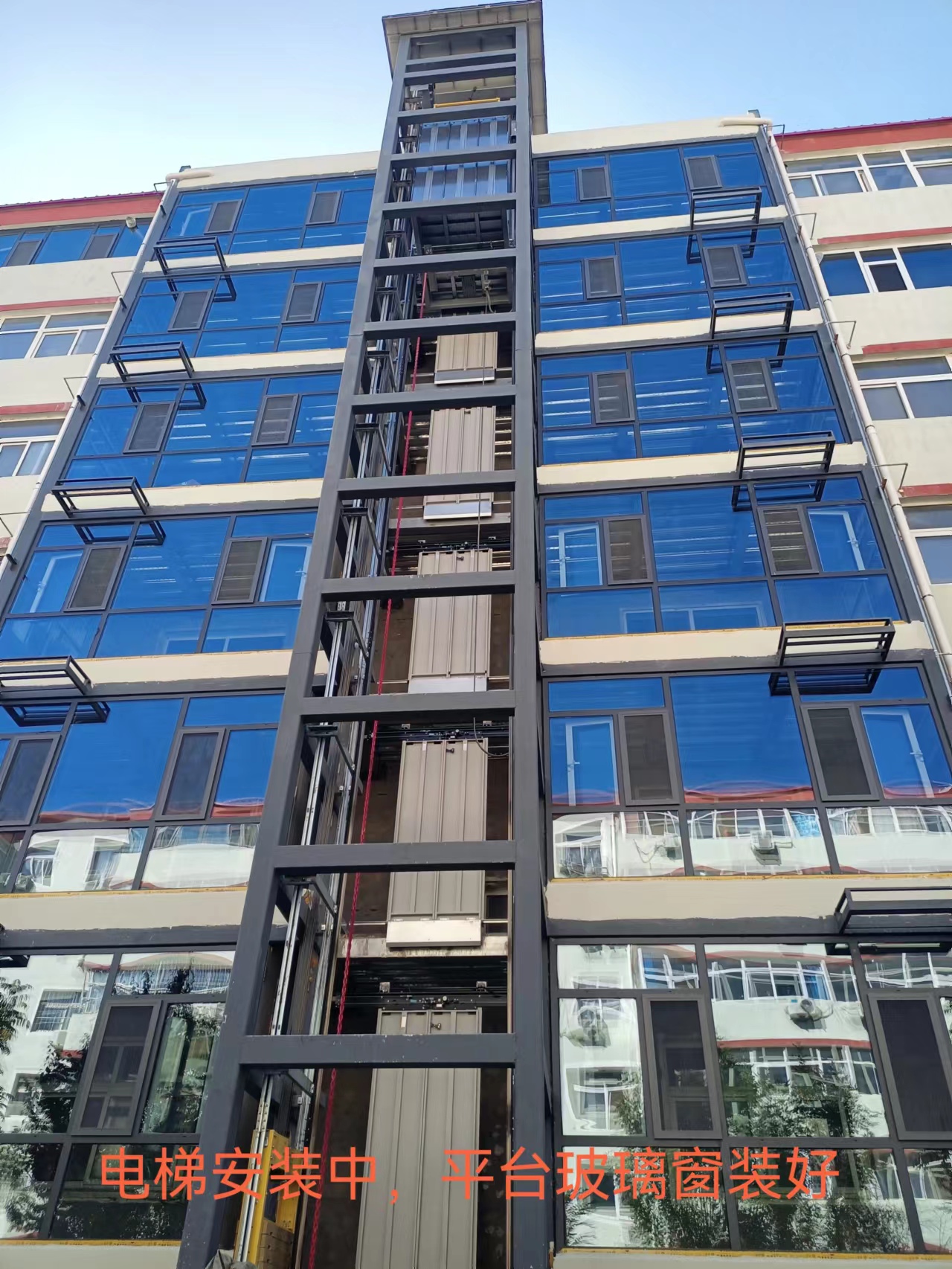 目前電梯在安裝中,平臺已經(jīng)鋪好,平臺玻璃窗戶安裝好。