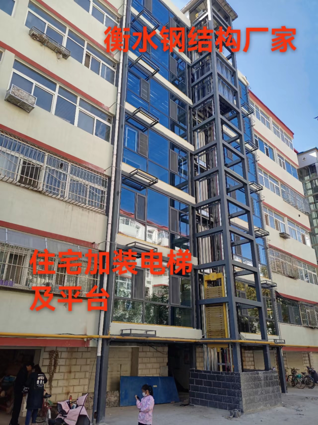 加裝電梯井道和平臺由金鼎鋼構(gòu)設(shè)計(jì)加工安裝。