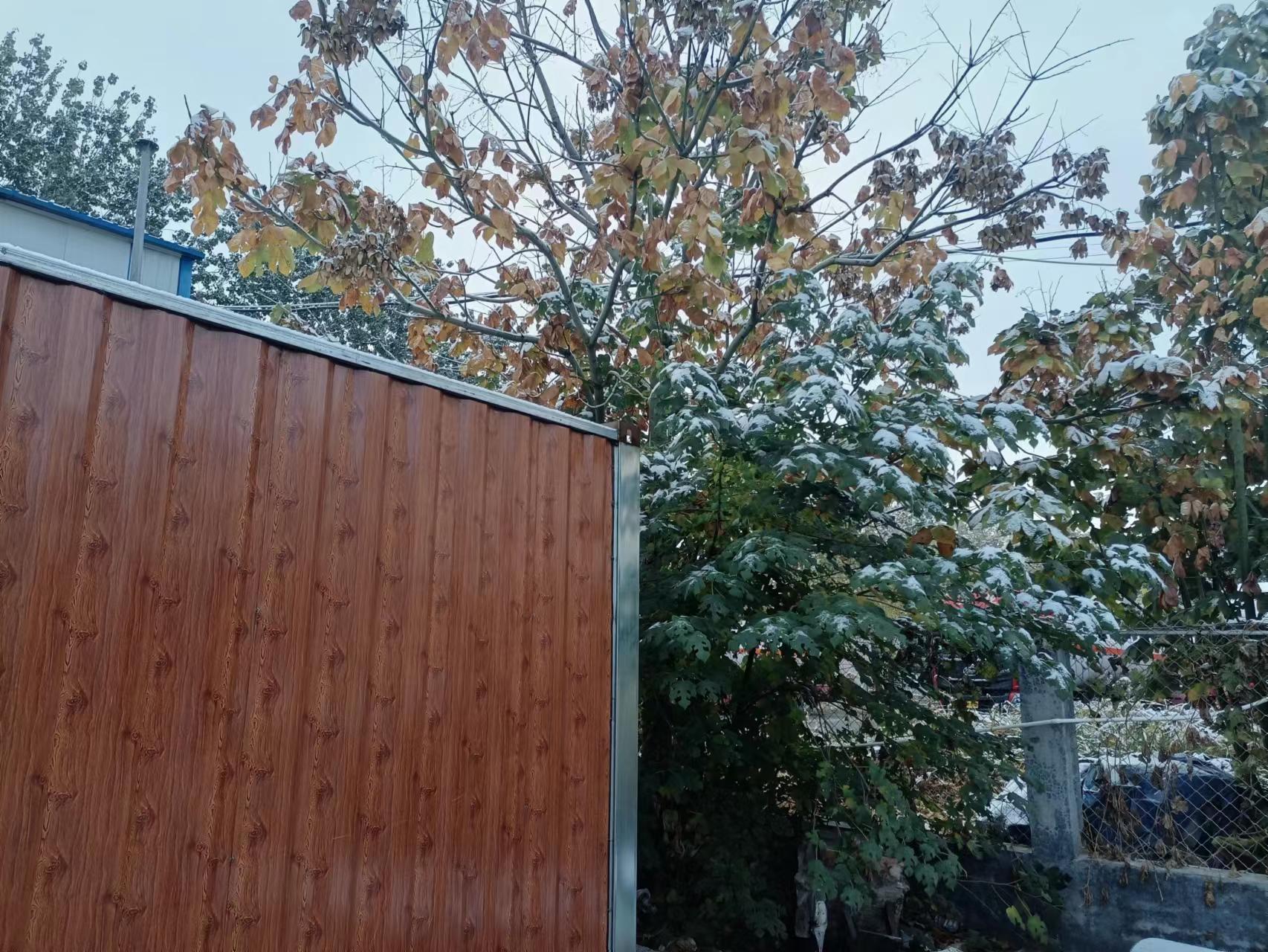 我們的工地也下過雪了。綠色防護網上有少量積雪。工人們將開啟新的**的勞作。